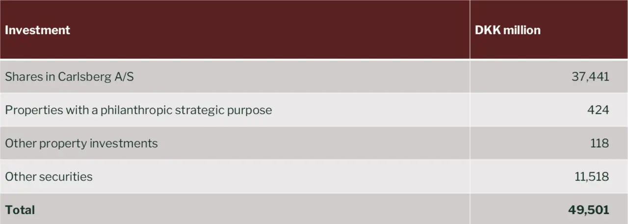 The Carlsberg Foundation’s available funds are defined as investments and assets other than shares in Carlsberg A/S and certain properties. These available funds of around DKK 11.5 billion are invested in accordance with the foundation’s investment policy.