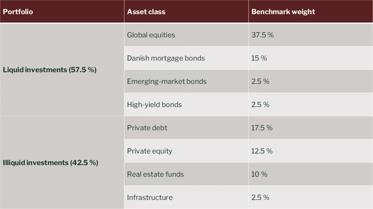 The Carlsberg Foundation aims to achieve a long-term risk-adjusted return by limiting investment costs and spreading risk across different types of financial asset. It has therefore chosen an asset allocation based on strategic weights for liquid and illiquid investments.