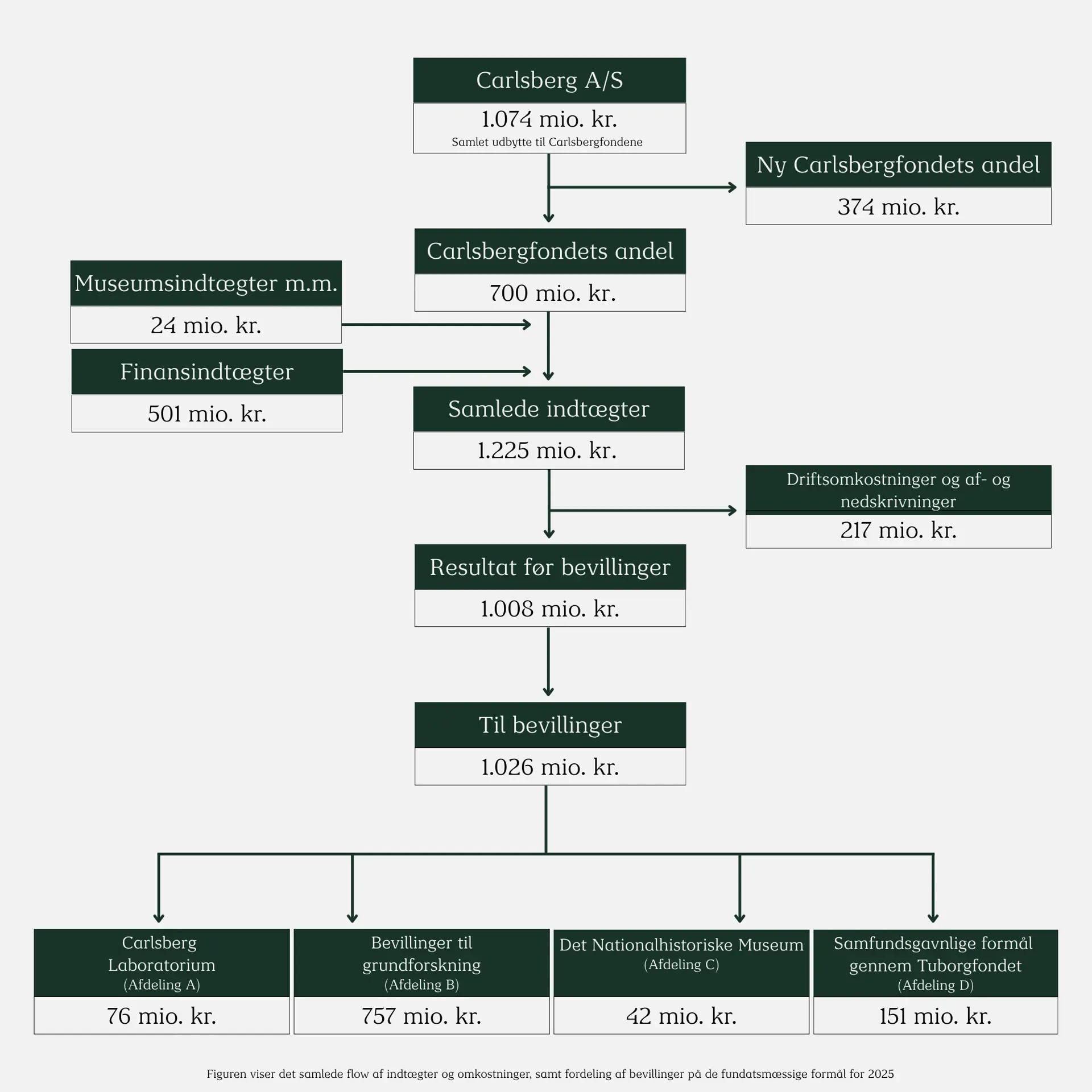 Den samlede størrelse af Carlsbergfondets årlige bevillingsramme afhænger af udbyttet af fondens aktier i Carlsberg A/S. Dette suppleres med indtægter fra andre finansielle aktiviteter, som er påvirket af den globale økonomi og dens påvirkning på de finansielle markeder.