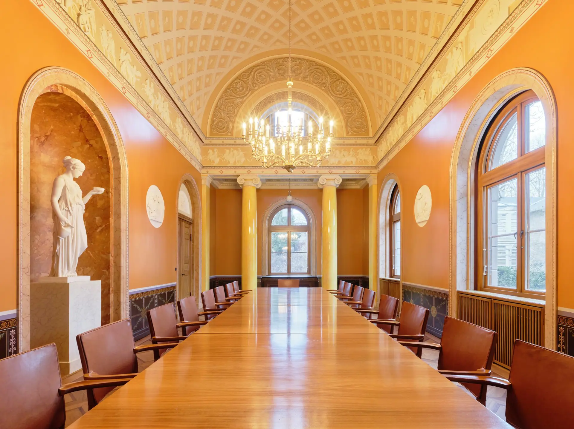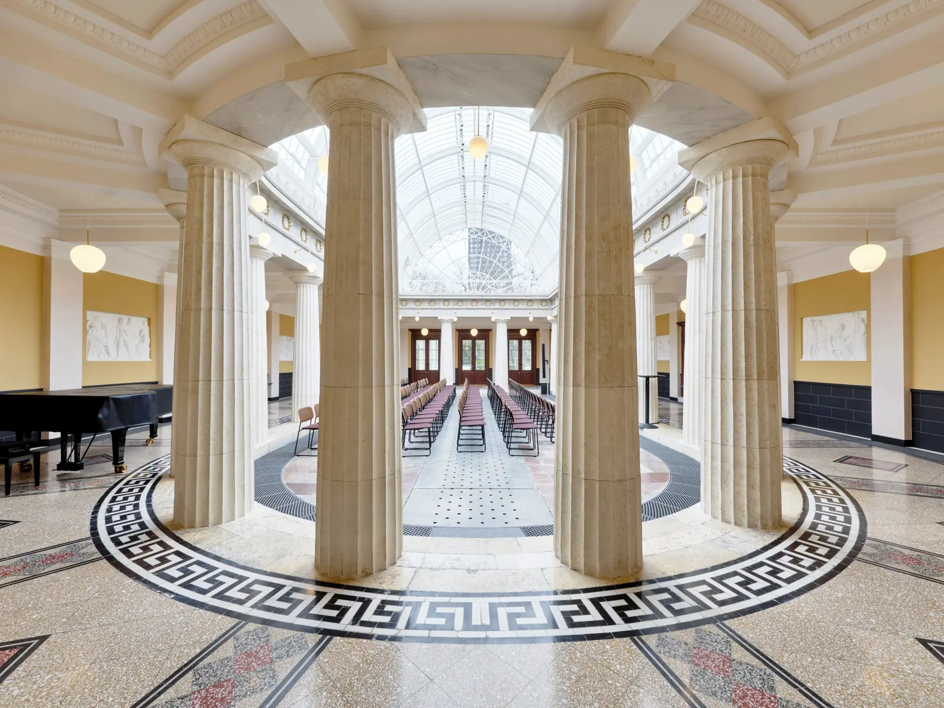 På østvæggen og i apsis i rummet er der opsat en række kopier af antikke buster side om side med buster af folk, der repræsenterede datidens kunst, videnskab og politik. Busterne var en slags ikoner for brygger Jacobsen. Her er digteren Homer, statsmanden Perikles og generalen Scipio sammen med kunstneren Bertel Thorvaldsen, videnskabsmanden H.C. Ørsted og politikeren L. N. Hvidt, hvilket illustrerer bryggerens mangfoldige interesser. Desuden er også bryggeren afbildet som buste. Busterne er udført af V. Bissen og Th. Stein. Bygningen er desuden forsynet med mosaikker med kopier af mønstre fra Pompeji.