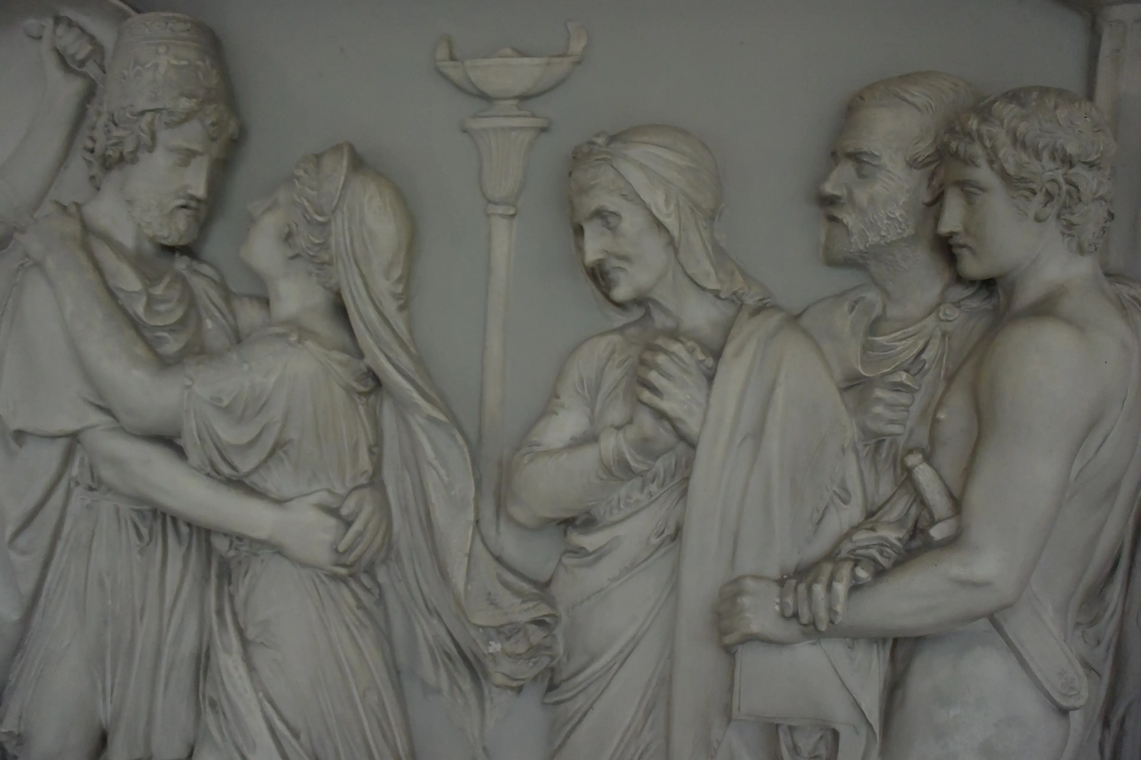 Et af ni af Theobald Steins relieffer i Pompeji. Motiv fra Odyssen. I baggrund ses Eumaios gengivet med J.C. Jacobsens ansigtstræk