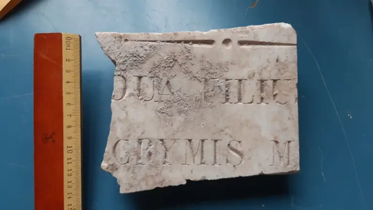 Fragmenteret gravsten fra 1800-tallet-begyndelsen af 1900-tallet med latinske indskrifter fundet under udgravningerne på Cæsars Forum i Rom. Foto: The Caesar’s Forum Project.