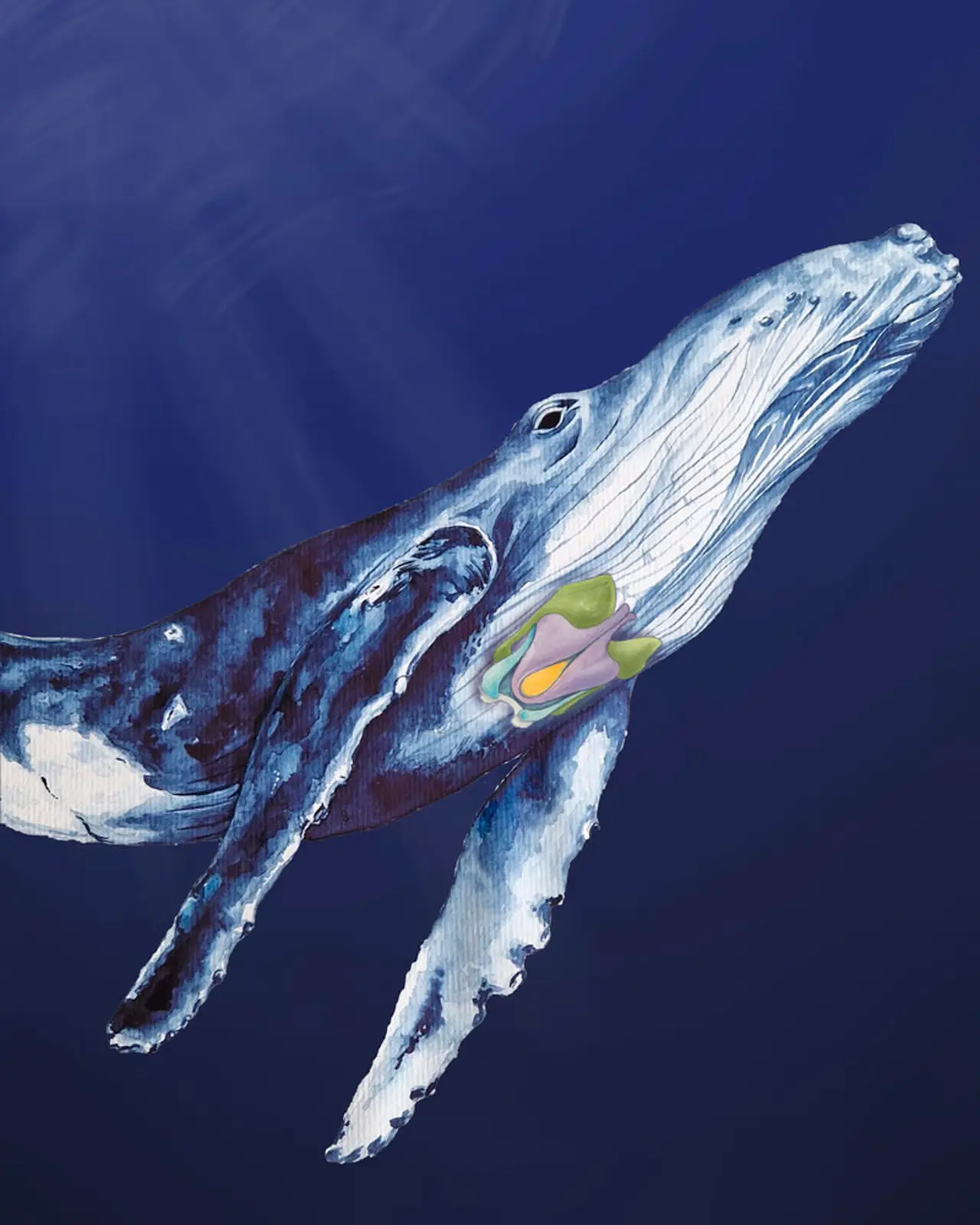 Maleri af pukkelhval med strubehoved. Af Patricia Jaqueline Matich