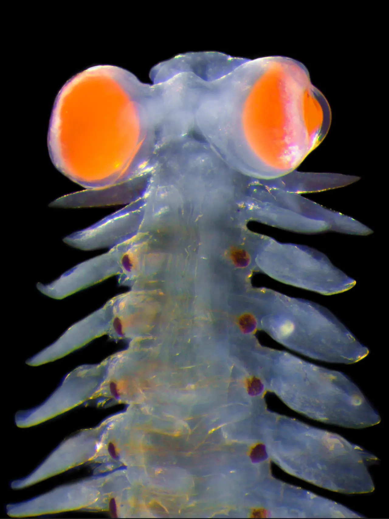 Hundredvis af røde prikker bevæger sig dansende op og ned i Middelhavets nattemørke. Prikkerne optræder i par, for der er tale om øjne. Røde øjne, som i bogstaveligste forstand buler ud som på stilke i forlængelse af hovedet. Øjnene sidder på gennemsigtige børsteorme, der er mellem fire og 30 centimeter lange.
