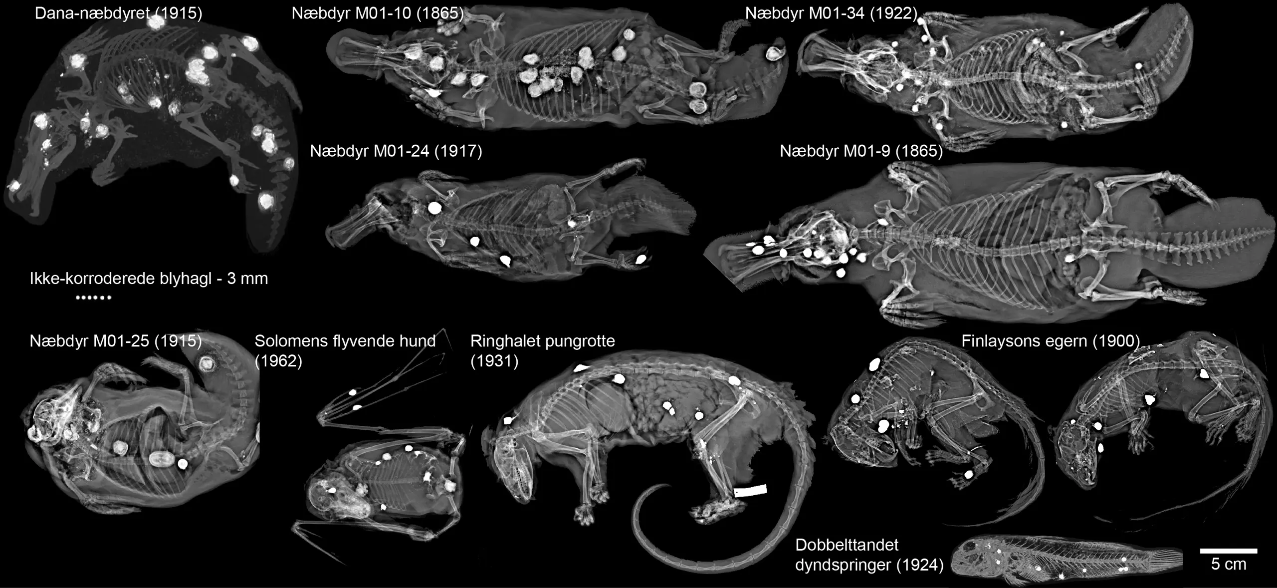 Røntgenbilleder af små pattedyr i Statens Naturhistoriske Museums samling indeholdende kugler af blyhagl.