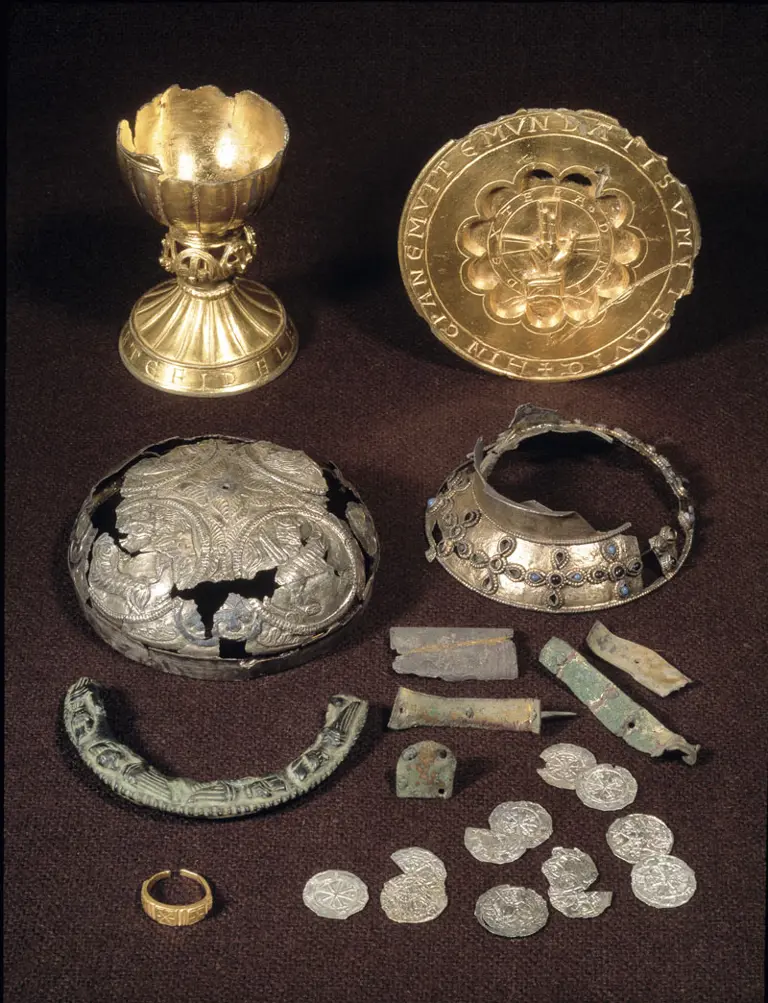 I perioden 950 til 1200 blev der skabt fremragende dansk arkitektur, kunst og litteratur, og meget andet blev importeret, som bl.a. de fire øverste genstande på billedet. Alle genstande på billedet er fundet på Haraldsborg ved Roskilde. Borgen blev ødelagt i borgerkrigen ca. 1132. Foto: Lennart Larsen, Nationalmuseet